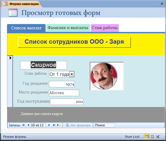 Созданная «Форма навигации» (имя этой форме можно задавать любое) имеет несколько вкладок, что даёт возможность просматривать различные формы с одной общей. При её создании команды для обработки событий: наезд мышью на объект, щелчок левой или правой кнопкой мыши и т.п., не потребовало написания программных кодов. Неудобством формы навигации является то, что она позволяет объединять только формы запросов (один из объектов базы данных).