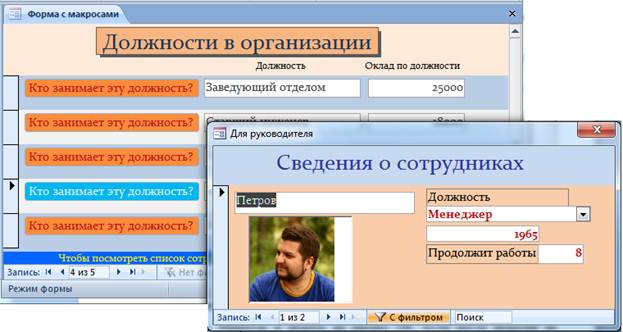 Для решения поставленной задачи понадобится иметь две формы. Первая форма – главная, которая содержит список должностей на определённый момент времени в организации. Вторая форма – подчинённая, должна содержать сведения, которые интересуют руководителя. Из подчинённой формы должны выбираться данные, относящиеся к условию, которое задаёт руководитель. Следовательно, связь между формами возлагается на программу, которая формируется с помощью макросов. Выполним несколько шагов для решения, поставленной задачи.