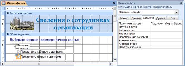 взаимодействии с переключателем. Выделите на форме в режиме Конструктор первый