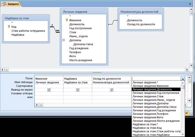 Создав в таблице «Личные сведения» поле «Доплаты» с множественным значением данных, мы добились компактности их хранения, но встаёт вопрос, как работать с такими данными? Предположим, что планово-экономическому отделу необходимо разработать фонд заработной платы сотрудников организации, при этом, требуется знать величину надбавки для каждого сотрудника, его ставку (оклад по должности) и суммарный коэффициент, на который увеличивается оклад сотрудника. Используя возможности Access 2010, эта процедура не вызывает затруднений. Для начала необходимо продумать, в каких исходных таблицах можно найти необходимые значения данных, а затем приступить к формированию запроса.